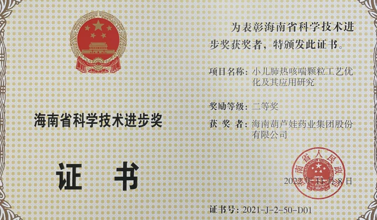 葫芦娃药业集团申报的专利“克咳片及其制备方法”荣获 第四届海南省专利奖金奖