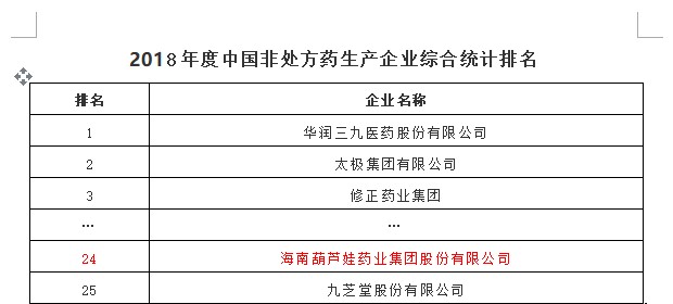 2018年11月15日,中国非处方药物协会发布《2018年度中国非处方药企业及产品榜》,葫芦娃药业集团由2017年度中国非处方药生产企业综合排名第32名跃升至第24名。